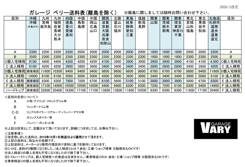☆Garage VARY 送料表☆